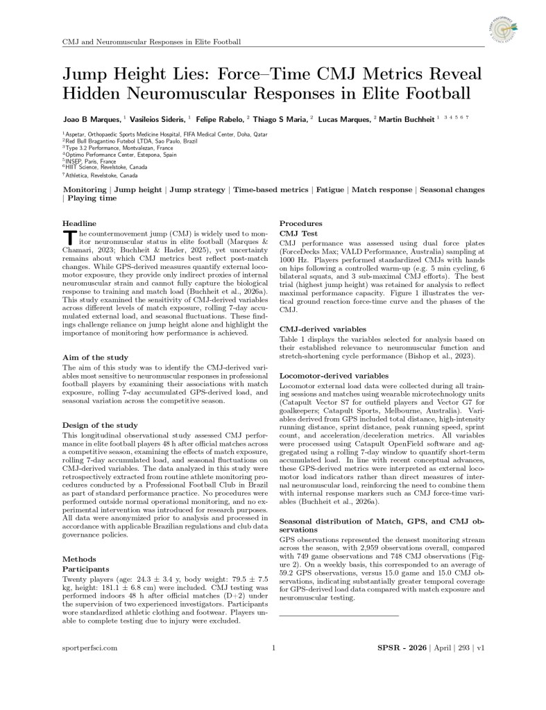 27 April 2026 SportPerfSci Reports Jump Height Lies: Force–Time CMJ Metrics Reveal Hidden Neuromuscular Responses in Elite Football SPSR293_MarquesDownload Partager : Share on X (Opens in new window) X Share on Facebook (Opens in new window) Facebook Share on WhatsApp (Opens in new window) WhatsApp Email a link to a friend (Opens in new window) Email Print (Opens in new window) Print Like this:Like Loading...