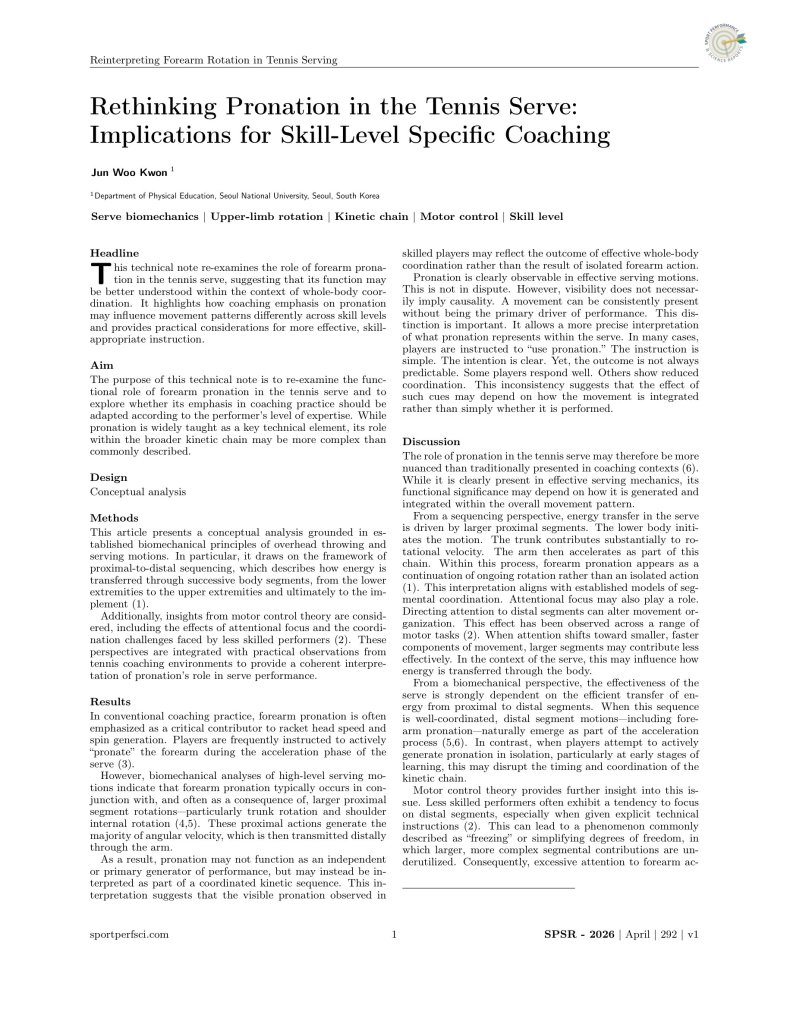 22 April 2026 SportPerfSci Reports Rethinking Pronation in the Tennis Serve: Implications for Skill-Level Specific Coaching SPSR292_KwonDownload Partager : Share on X (Opens in new window) X Share on Facebook (Opens in new window) Facebook Share on WhatsApp (Opens in new window) WhatsApp Email a link to a friend (Opens in new window) Email Print (Opens in new window) Print Like this:Like Loading...